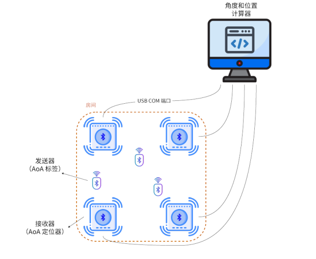 Receiver(AoA Locator)接收器(AoA定位器)Transmitter (AoA Tag)發(fā)送器(AoA標簽)USB COM Port(USB COM端口)Room(房間)