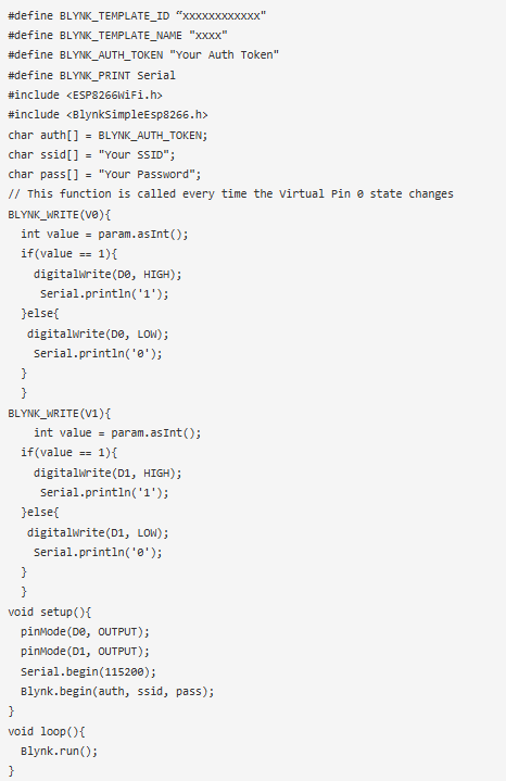 此代碼用于使用Blynk應(yīng)用程序控制兩個(gè)數(shù)字引腳(D0和D1)。