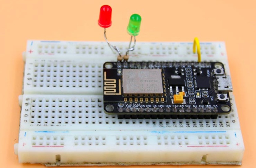 按照上述原理圖將led連接到NodeMCU上。一個(gè)LED連接GPIO D0,另一個(gè)連接GPIO D2。不要忘記在GPIO引腳和正極之間放一個(gè)電阻。它將保護(hù)我們的LED過電壓。一旦連接完成,您的設(shè)置將如下所示