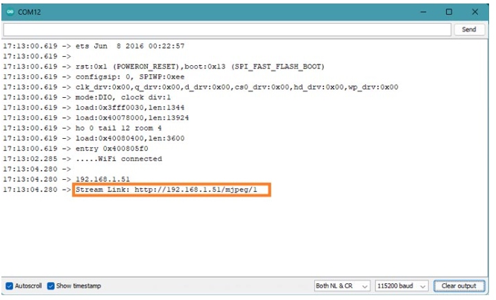上傳完成后,將單板從PC上拔下。從ESP32-CAM板上拆除IO0和GND跳線連接,然后將其再次插入PC。打開串口監(jiān)視器,按下單板上的復(fù)位按鈕。通過這樣做,ESP32-CAM模塊將嘗試連接到配置的WiFi網(wǎng)絡(luò)。