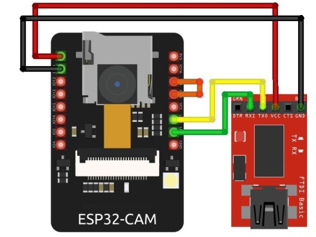 將FTDI模塊上的VCC連接到ESP32-CAM的5V電源引腳上。