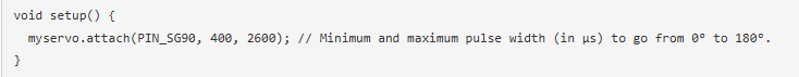 在Setup()函數(shù)中,給定伺服連接到板上的信號(hào)引腳細(xì)節(jié)到attach()函數(shù)到對(duì)象myservo。我已經(jīng)將伺服的信號(hào)引腳連接到Pico板的GP-0引腳上。此外,attach()函數(shù)用于指定引腳和以微秒為單位的最小和最大脈沖寬度值,以便將伺服器從0°旋轉(zhuǎn)到180°。在這種情況下,最小脈寬設(shè)置為400μs,最大脈寬設(shè)置為2600μs。