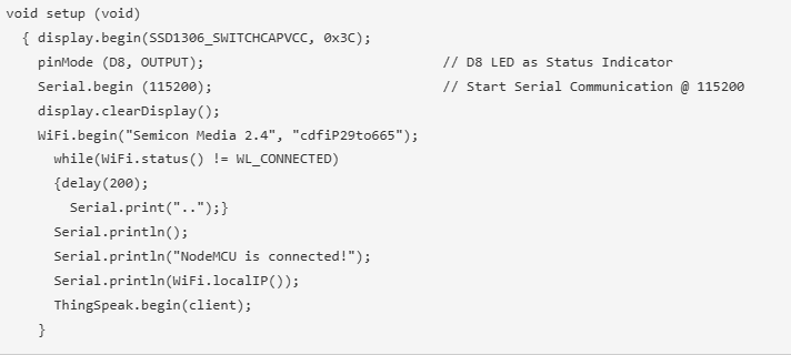 首先,我們必須包含成功執(zhí)行代碼所需的所有庫。庫包括SPI, WIRE, Adafruit_SSD1306和Adafruit_GFX。ESP8266WiFi ThingSpeak。此外,我們還定義了進(jìn)一步編程所需的變量和對象。