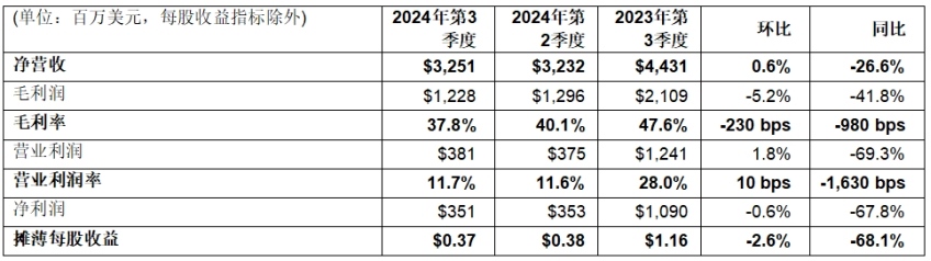 · 第三季度凈營(yíng)收32.5億美元;毛利率37.8%;營(yíng)業(yè)利潤(rùn)率11.7%,凈利潤(rùn)3.51億美元