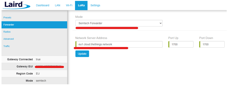 完成后,重新登錄到您的網(wǎng)關(guān)。單擊LoRa,然后單擊轉(zhuǎn)發(fā)器,并使用我們從TTN設(shè)置過程中復(fù)制的地址更新網(wǎng)絡(luò)服務(wù)器地址。