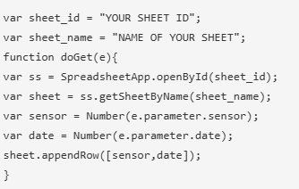 現(xiàn)在我們的Google表單已經(jīng)設(shè)置好了,讓我們創(chuàng)建一個(gè)Google應(yīng)用程序腳本。這個(gè)腳本將使我們能夠?qū)?shù)據(jù)從ESP推送到Google表。要?jiǎng)?chuàng)建Google腳本,請(qǐng)轉(zhuǎn)到Extensions -> Apps script(以前這個(gè)選項(xiàng)在Tools -> script Editor下)。然后將以下代碼復(fù)制粘貼到其中。