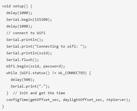 setup()函數(shù)將初始化串行通信,并使用我們已經(jīng)添加的憑據(jù)建立WiFi連接。它還將初始化一個(gè)名為configTime的實(shí)例,用于從NTP服務(wù)器獲取時(shí)間。