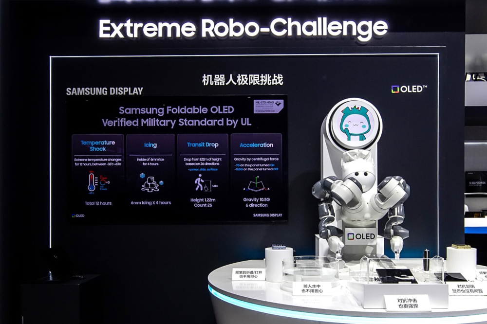 三星在追求產品卓越品質的道路上,從不懈怠。為了打造高品質產品,三星對旗下產品進行了各項嚴苛的測試。為了直觀展現(xiàn)其對產品品質的高標準嚴要求,三星特地將應用于OLED生產線的“OLED Bot”帶到展會現(xiàn)場,通過機器人表演,將可折疊屏放入裝滿水的容器進行防水測試,并通過撒鹽、撒胡椒粉、用鐵刷球摩擦等方式進行劃痕測試,展示三星折疊屏獨有的強悍耐久性。