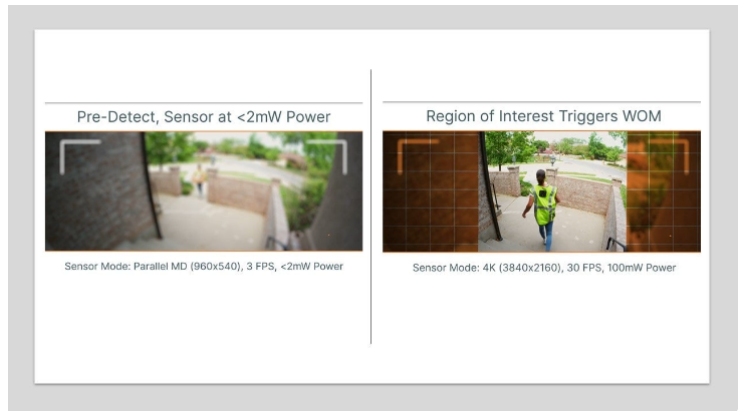 門禁(如可視門鈴、生物特征識別)、公共安全與防護(如執(zhí)法記錄儀)及安保(如監(jiān)控攝像頭)等領(lǐng)域使用的視覺系統(tǒng)都可以利用 WoM 功能。例如,可視門鈴要么采用電池供電,要么采用墻插供電,功率非常低(功率因數(shù)為 1 時小于 20W)。對于前一種情況,目前的行業(yè)趨勢要求充電周期達到 180 天,最終目標是達到一年。如果沒有像 WoM 這樣的功能,那么無論場景中是否存在相關(guān)運動,系統(tǒng)都將不得不始終以選定的幀率處理全分辨率圖像。但在大多數(shù)情況下,只有當某個人走到門口時,這種處理才有意義。借助 WoM 模式,可視門鈴大部分時候處于預(yù)檢測狀態(tài),系統(tǒng)以超低功耗運行,只有檢測到運動時,才進入正常工作狀態(tài)。