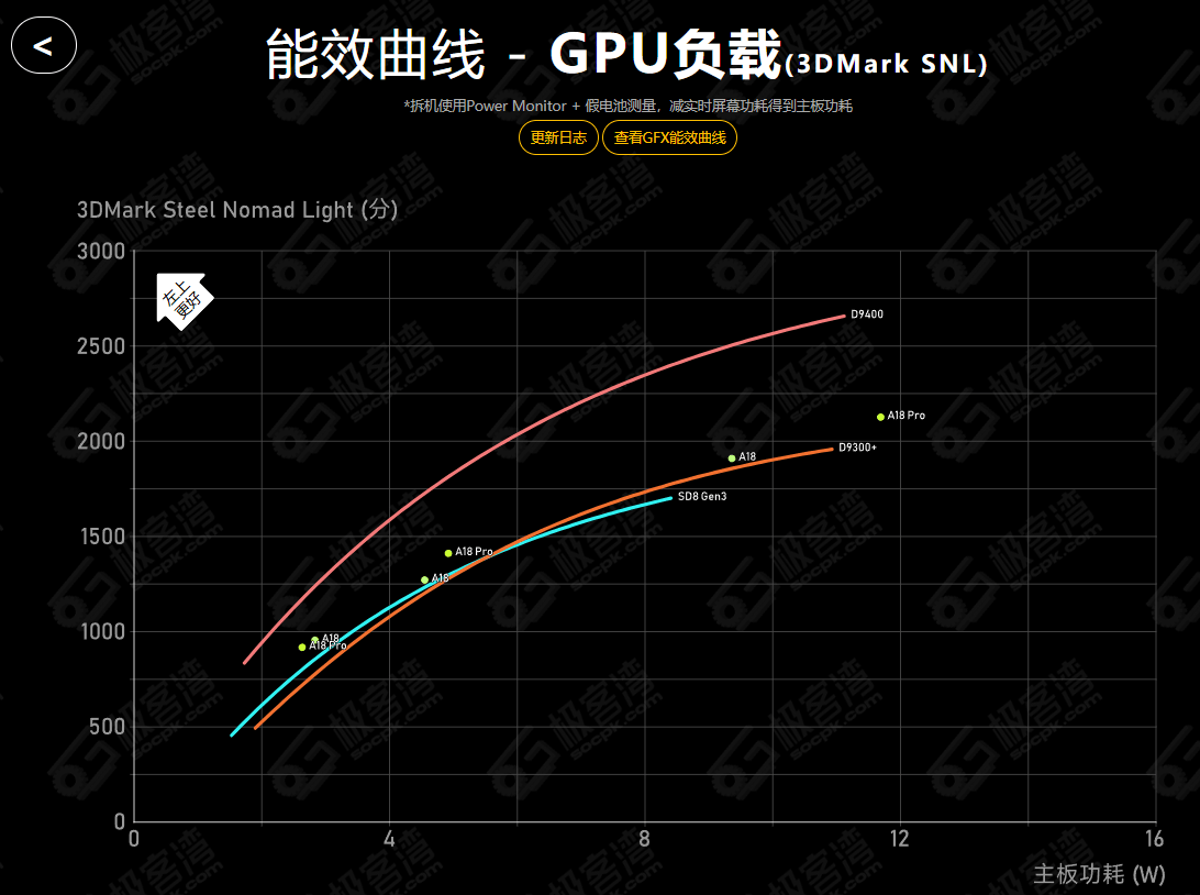 根據(jù)極客灣的測試數(shù)據(jù),天璣9400在GPU全頻段的能效表現(xiàn)超越了同級別的A18 Pro,峰值性能算下來更是超越A18 Pro 86%,標志著安卓陣營在GPU性能和能效上的又一次全面超越。