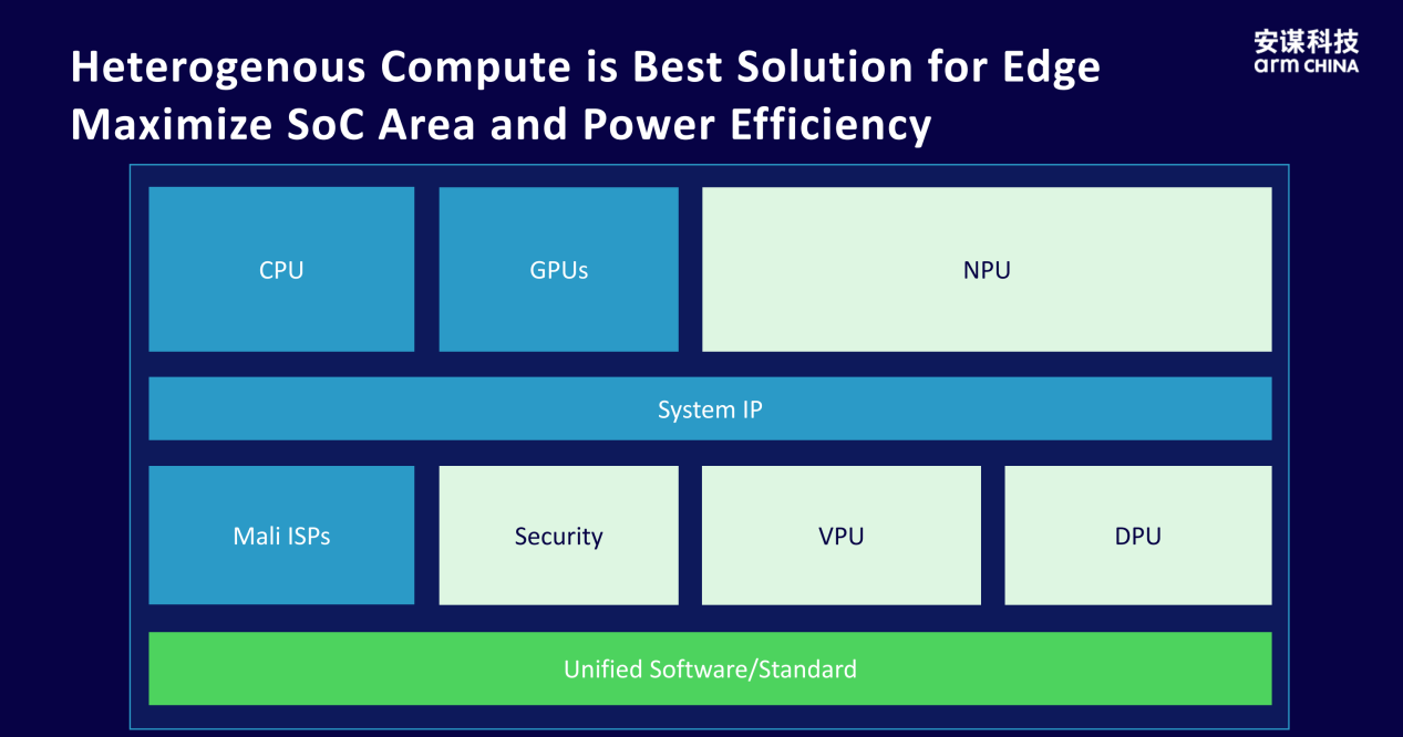 鮑敏祺在演講中特別強(qiáng)調(diào)了“周易”NPU對(duì)異構(gòu)計(jì)算的支持,并指出無(wú)論是從能效還是整個(gè)SoC(系統(tǒng)級(jí)芯片)的面積角度來(lái)看,異構(gòu)計(jì)算都是端側(cè)AI芯片的最佳選擇。他解釋道,面對(duì)不同的應(yīng)用場(chǎng)景,異構(gòu)計(jì)算能夠?qū)崿F(xiàn)算力的靈活裁剪,并將不必要的功耗降到最低。