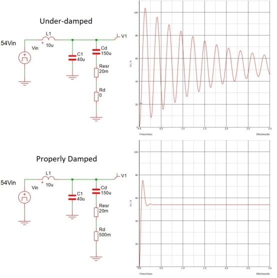 傳統(tǒng)的12V系統(tǒng)通常假設(shè)阻尼電容器有足夠的有效串聯(lián)電阻(ESR)來(lái)抑制共振。但是,對(duì)于低成本的鋁電解電容器,實(shí)際有效的ESR比公布的最大值要低得多,當(dāng)使用電池功率時(shí),會(huì)產(chǎn)生更少的阻尼和更大的震動(dòng)。在12V系統(tǒng)中,降低阻尼可能仍足以防止下游直流/直流的不穩(wěn)定性,而且響鈴不會(huì)造成損害。然而,在48V系統(tǒng)中,更容易發(fā)生鈴聲,您可以添加離散電阻器與輸入阻尼電容器串聯(lián)。基于穩(wěn)定的脈動(dòng)電流,0603(1608公制)應(yīng)該足夠了。