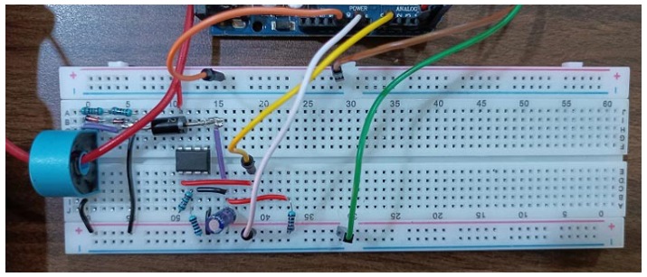 在上述電路圖中,我們使用交流電壓源作為次級(jí)繞組電壓。這是如何整流器和放大器電路看起來(lái)像面包板。