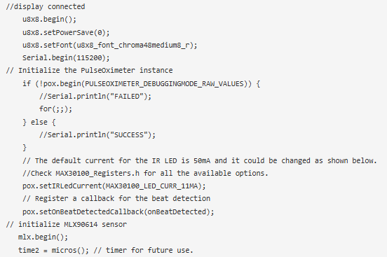除此之外,我們還使用了OLED模塊。所以,我們還需要安裝OLED庫。脈搏血氧計(jì)傳感器計(jì)算SPO2,心率和HRV使用的概念稱為PPG或PhotoPlethysmoGraphy,如前所述。MAX3010X庫可以使用回調(diào)函數(shù)識別反射率的脈沖或變化。該函數(shù)是一個中斷,每次檢測到心跳時都會調(diào)用該中斷。存儲連續(xù)兩次心跳之間的時間間隔來計(jì)算HRV參數(shù)。每個REPORTING_PERIOD_MS間隔都會計(jì)算心率。由于手指用于測量體溫,我們對MLX90614傳感器測量的值進(jìn)行了補(bǔ)償。