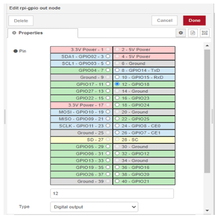 然后雙擊節(jié)點,選擇GPIO18引腳,并選擇“數(shù)字輸出”作為輸出類型。