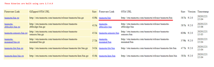 現(xiàn)在,在下一步中,下載Tasmota固件文件。有一個很大的固件文件列表。這些bin文件的不同之處在于,每個bin文件都包含不同的內(nèi)置驅(qū)動程序,用于各種傳感器和其他設(shè)備。如果您不確定哪個二進(jìn)制文件適合您,只需從“tasmota.bin”開始。它包括大多數(shù)兼容硬件所需的所有功能。