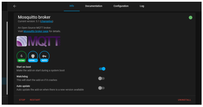 現(xiàn)在打開Mosquito MQTT Broker附加組件,然后單擊install。安裝完成后,單擊Start,啟動Mosquito代理。