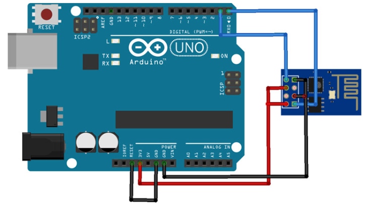 要在ESP-01上閃現(xiàn)新固件,請按照電路圖將ESP-01與Arduino Uno連接。