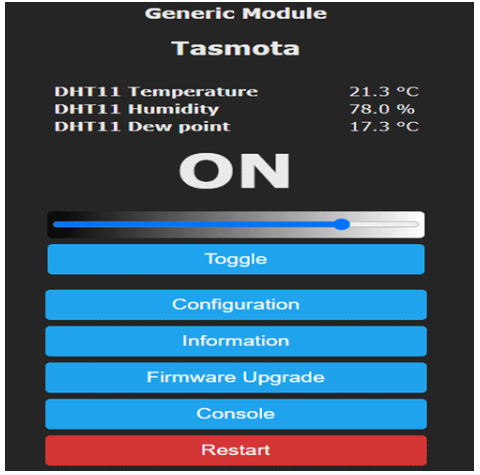 之后,單擊“Save”保存更改。ESP-01將重啟。然后轉(zhuǎn)到主菜單,您將在您的Tasmota Web UI上擁有功能齊全的LED控件。使用滑塊來改變LED亮度,使用撥動開關(guān)來打開和關(guān)閉LED。