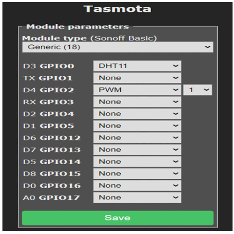 默認(rèn)情況下,模塊類型為‘ Generic(0) ’。因此,您需要將其更改為“Generic(18)”。然后在GPIO 2中,我選擇“PWM”來控制GPIO0上的LED和DHT11,您可以將其更改為繼電器,新像素或任何其他傳感器。