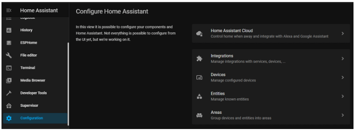 現(xiàn)在,再次轉(zhuǎn)到您的Home Assistant Web UI,在左側(cè)菜單上單擊Configuration以加載配置頁面。然后轉(zhuǎn)到integration。