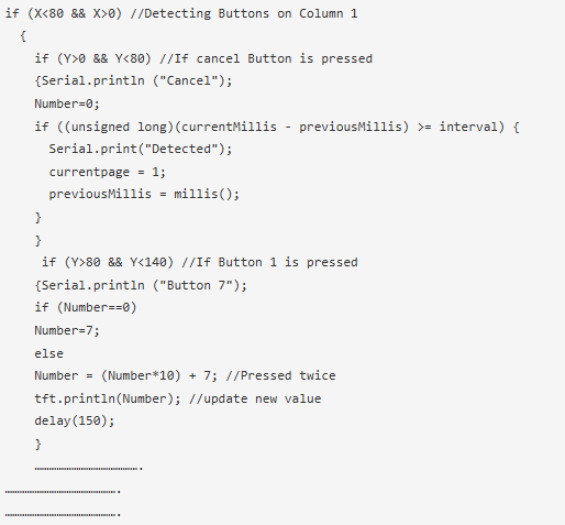 現(xiàn)在,在創(chuàng)建UI之后,第二部分包括檢測每個(gè)按鈕的用戶觸摸,然后執(zhí)行與該按鈕相關(guān)的任務(wù)。每次用戶觸摸屏幕,我們就能知道他/她觸摸的像素的X和Y位置。該值可以顯示在串行監(jiān)視器上,如下所示。