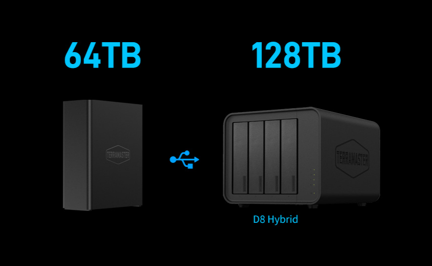 別看鐵威馬F8 SSD Plus體積小,但其性能卻一點也不含糊。它采用了高性能的處理器和萬兆網(wǎng)口,提供了高速的數(shù)據(jù)讀寫速度,確保了數(shù)據(jù)傳輸?shù)母咝?。同時,F8 SSD Plus不僅可以提供高達64TB的存儲容量,還通過USB3.2 10Gbps接口,F8 SSD Plus還能輕松連接USB外置存儲設備,實現(xiàn)存儲空間的進一步擴展。例如,與鐵威馬 D8 Hybrid搭配使用,可額外增加高達128TB的存儲空間,滿足您不斷增長的數(shù)據(jù)存儲需求。