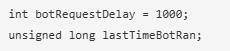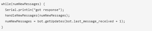 兩個(gè)變量botRequestDelay和lastTimeBotRan用于每隔x秒檢查新的電報(bào)消息。在我們的示例中,我們將每隔1000毫秒檢查一次新消息。我們可以通過(guò)更改botRequestDelay變量將延遲時(shí)間更改為我們的特定需求。