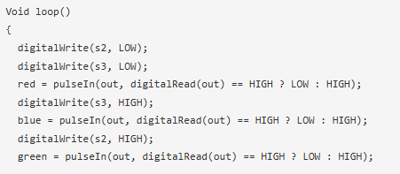 在loop()函數(shù)中,我們測(cè)量紅色、綠色和藍(lán)色的輸入頻率,并比較這些頻率讀數(shù)來檢測(cè)顏色??刂埔_S2和S3用于讀取顏色頻率。例如,讀取紅色頻率時(shí),將兩個(gè)引腳設(shè)置為低邏輯電平;讀取藍(lán)色時(shí),將S3引腳設(shè)置為HIGH, S2引腳設(shè)置為low;讀取綠色時(shí),將S2引腳設(shè)置為HIGH, S3引腳設(shè)置為low。