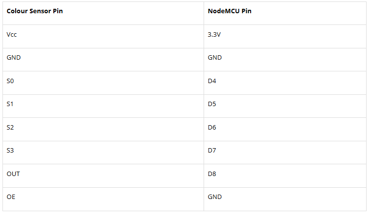 在繼續(xù)之前,讓我們先介紹一下這個(gè)模塊的規(guī)范。該模塊的工作電壓為3V至5V,這意味著它可以直接與任何微控制器接口,這就是為什么它是我們的NodeMCU的完美選擇,它使用3.3V邏輯電平。除了電源和地,它還有一個(gè)使能引腳E0,通過將其拉低或拉高,我們可以禁用或啟用芯片。OUT引腳用于提供輸出頻率,S0和S1選擇線選擇輸出頻率縮放。S2和S3選擇線選擇光電二極管類型。在測(cè)量顏色波長(zhǎng)后,它將結(jié)果輸出為頻率,因此我們可以直接測(cè)量頻率并確定顏色,從而減少了ADC的干預(yù)。最后,該傳感器可以在1cm的距離內(nèi)精確測(cè)量被測(cè)物體。如果您想了解有關(guān)其規(guī)范的更多信息,可以查看TCS3200模塊的數(shù)據(jù)表