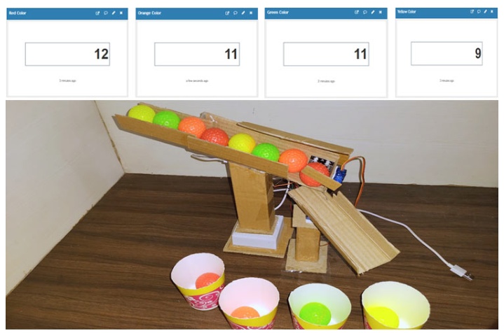 在獲得紅色、綠色和藍(lán)色的頻率值之后,比較這些值來檢測(cè)顏色。在檢測(cè)到顏色后,首先,以特定的角度移動(dòng)落點(diǎn)伺服器,使彩球掉落到相應(yīng)的盒子中,然后移動(dòng)拾取伺服器以傳遞球。每種顏色的頻率值隨距離而變化,可以相應(yīng)地定制。識(shí)別顏色后,將檢測(cè)到的顏色球的數(shù)量發(fā)送給ThingSpeak。