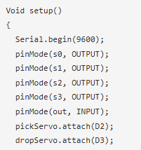 在setup()函數(shù)中,我們以9600波特初始化Serial。然后將顏色傳感器引腳定義為輸出引腳以讀取頻率值,還定義了頂部和底部伺服電機(jī)的引腳。