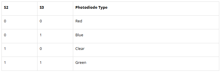 在該模塊中,16個(gè)相同顏色的光電二極管并聯(lián)連接??刂埔_S2和S3用于選擇光電二極管陣列。例如,我們可以通過將S2和S3設(shè)置為低邏輯電平來讀取紅色光電二極管。完整的表格如下: