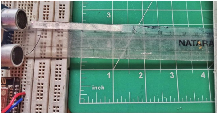 經(jīng)過(guò)測(cè)試,我們?cè)O(shè)置了一個(gè)水位儀來(lái)演示工作。我們把超聲波傳感器貼在罐子的頂部,還放了一個(gè)尺子進(jìn)行測(cè)量。這樣,監(jiān)視器將顯示以cm為單位的罐子的空度數(shù)據(jù)。下面是設(shè)置的樣子