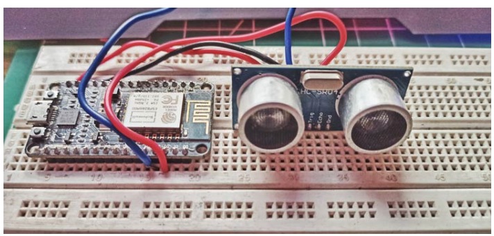我使用面包板將超聲波傳感器與NodeMCU連接起來(lái),然后使用連接線進(jìn)行連接。我的測(cè)試設(shè)置如下所示,稍后我們將使用較長(zhǎng)的跳線將傳感器安裝在演示水箱上。