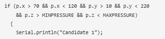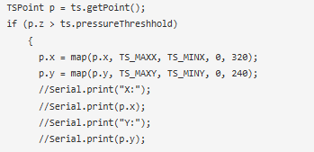 現(xiàn)在,在代碼的第二部分中,我們將檢測(cè)按鈕接觸點(diǎn),然后使用這些點(diǎn)來(lái)預(yù)測(cè)按鈕。. ts.getPoint()函數(shù)用于檢測(cè)TFT顯示器上的用戶(hù)觸摸。ts.getPoint給出了觸摸區(qū)域的原始ADC值。然后使用地圖函數(shù)將這些RAW ADC值轉(zhuǎn)換為像素坐標(biāo)。
