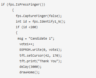 當(dāng)選民按下候選人按鈕時(shí),他將被要求掃描指紋傳感器上的手指。如果手指ID被授權(quán),那么選民就可以投票。如果任何未注冊(cè)的用戶(hù)想要投票,那么指紋模塊將不會(huì)將其ID檢測(cè)到系統(tǒng)中,并且顯示器將顯示“對(duì)不起,您不能投票”。