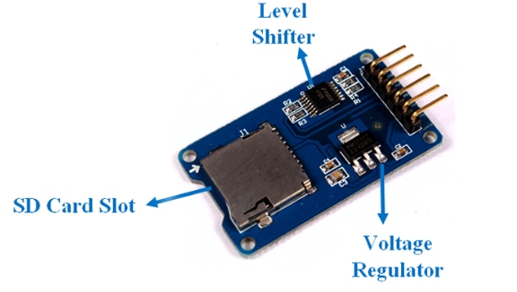 SD卡模塊是一個(gè)簡單的板,用于連接Micro SD卡和Arduino等微控制器。典型的SD卡模塊由兩個(gè)重要組件組成:穩(wěn)壓IC和5V至3.3V電平轉(zhuǎn)換器IC。該模塊有6個(gè)引腳;其中兩個(gè)用于模塊供電,四個(gè)引腳用于SPI通信。