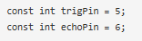 然后在接下來的幾行中,我們定義了連接超聲波傳感器的引腳。我們已經(jīng)將三角引腳連接到D5,回聲引腳連接到D6