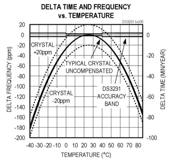 下面是一個(gè)帶有集成 TCXO 和晶體的 RTC 示例。DS3231SN 的精度規(guī)格在 -40° 至 85°C 的整個(gè)工作溫度范圍內(nèi)支持最高 3.5 ppm,但在 0° 至 40°C 的整個(gè)工作溫度范圍內(nèi)僅支持 2 ppm。圖 1顯示了顯示 TCXO 和典型晶體振蕩器之間精度差異的圖。