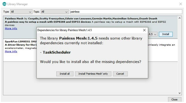 這個庫還使用ArduinoJson, TaskScheduler, ESPAsyncTCP和AsyncTCP庫。當你點擊install時,它也會要求安裝這些庫。所以,點擊“Install All”。