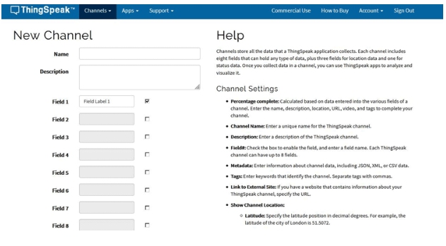 用你的憑證登錄ThingSpeak,然后點(diǎn)擊“新頻道”。現(xiàn)在填寫項(xiàng)目的詳細(xì)信息,如名稱、字段名稱等。這里我們必須創(chuàng)建兩個(gè)字段名,如Latitude和Longitude。然后點(diǎn)擊“保存頻道”。