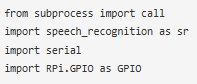 完整的語音識(shí)別程序與Pi可以找到在本頁的底部,一個(gè)解釋的代碼如下。我們首先導(dǎo)入語音識(shí)別模塊和其他需要的模塊,這些模塊用于將語音轉(zhuǎn)換為文本和將文本轉(zhuǎn)換為語音。在導(dǎo)入這些模塊之后,我們必須導(dǎo)入GPIO模塊,它控制樹莓派的引腳。