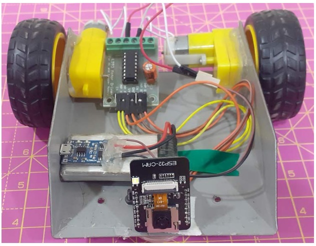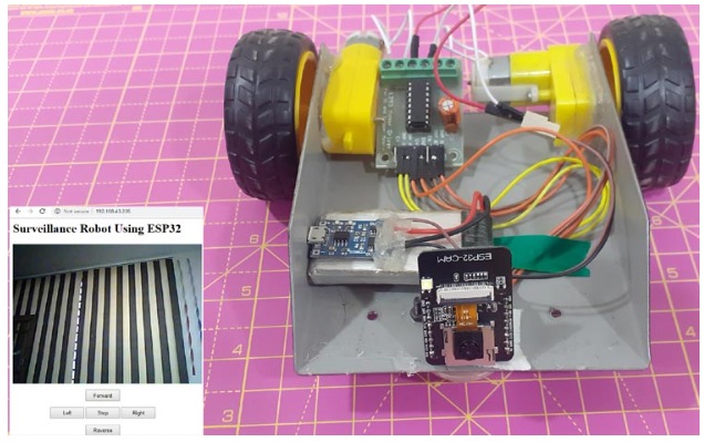 我們用現(xiàn)成的機(jī)器人底盤(pán)、輪子和直流電機(jī)制造了一個(gè)機(jī)器人。我們使用電池為電機(jī)驅(qū)動(dòng)模塊和ESP32-CAM供電。這是我的監(jiān)控機(jī)器人的樣子: