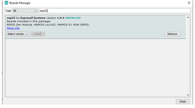 在板卡管理器中搜索ESP32并安裝“ESP32 by expressif Systems”。