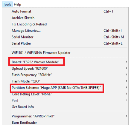 要上傳代碼,請(qǐng)將FDTI板連接到筆記本電腦,并選擇“ESP32 Wrover模塊”作為板。同時(shí),根據(jù)下圖更改其他設(shè)置: