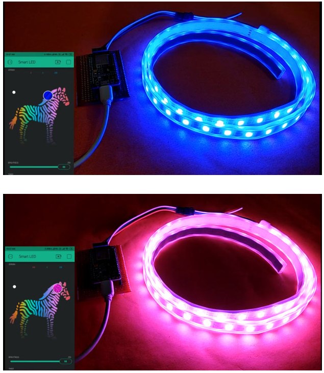 使用Arduino IDE將完整的代碼上傳到NodeMCU后,您可以在Blynk移動(dòng)應(yīng)用程序中控制NeoPixels LED條的顏色和亮度,如下圖所示。