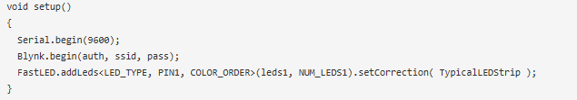 在setup()函數(shù)中,使用serial初始化串行通信。使用Blynk.begin開始并連接到Blynk云。另外,使用FastLED.addLeds設(shè)置LED的類型和數(shù)量。