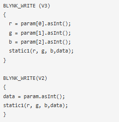 這里寫入BLYNK_WRITE函數(shù)來(lái)檢查V3和V2虛擬終端的傳入數(shù)據(jù),然后將它們分配到三個(gè)不同的變量中。這里的變量r, g, b表示所選顏色的Red, Green和Blue代碼的值。同樣,這里的數(shù)據(jù)用于存儲(chǔ)LED的亮度值。然后將這些值發(fā)送給用于驅(qū)動(dòng)LED條的函數(shù)static1。