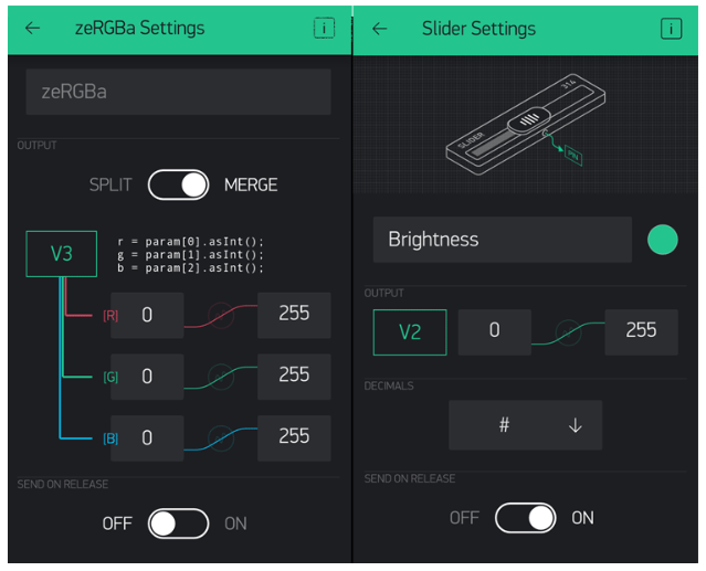 在拖動(dòng)小部件之后,它們現(xiàn)在設(shè)置用于將顏色和亮度值發(fā)送給NodeMCU的參數(shù)。